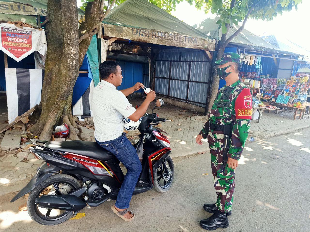 KENDARI,Sulawesibersatu.com – Serda Supardi bersama Serda Irwan Babinsa Koramil 1417-10/Kota Kodim 1417/ Kendari, melakukan Operasi Penegakan Disiplin Protokol Kesehatan Covid-19 di area Pelabuhan wawonii Kel. Dapu Dapura Kec. Kendari Barat Kota Kendari, Jum’at 23/10/2020.