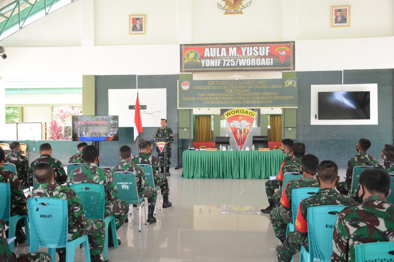Kegiatan ini dilaksanakan ialah untuk menindak lanjuti pasal 75 ayat 2 peraturan pemerintah nomor 39 Tahun 2010 tentang administrasi Prajurit Tentara Nasional Indonesia perlu menetapkan peraturan menteri pertahanan tentang pengembalian prajurit siswa yang di berhentikan tidak dengan hormat ke daerah asal penerimaan. Diharapkan seluruh peaserta sosialisasi dapat mengikuti kegiatan dengan sebaik baiknya, sehingga nanti para peserta dapat mengerti dan memahami keputusan yang telah di tetapkan Permenhan,”Terangnya