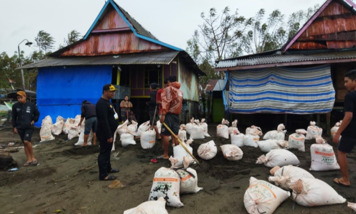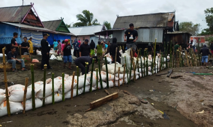 Takalar Sulsel, Sulawesibersatu.com-Sebagai upaya cepat dalam menanggulangi Abrasi Pantai yang terjadi di Pesisir Pantai akibat cuaca buruk angin kencang dan ombak besar, Pemerintah Desa Popo Kecamatan Galesong Selatan Kabupaten Takalar Provinsi Sulawesi Selatan (Sulsel) bersama warga kerja bakti melakukan pembuatan tanggul sementara pada Senin (26/12/2022).