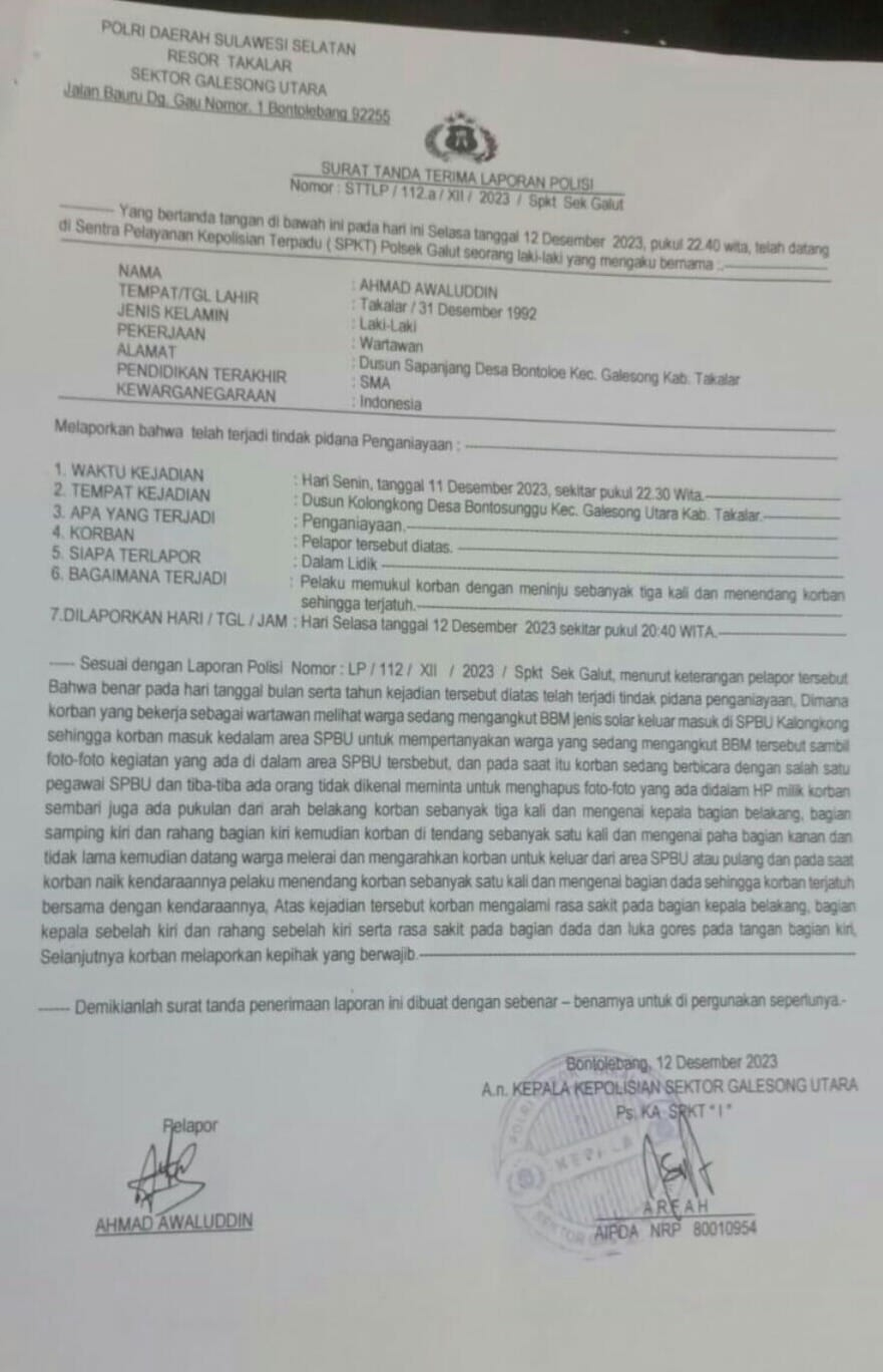 Takalar Sulsel, Sulawesibersatu.com-Lagi-lagi seorang Wartawan mendapatkan perlakuan buruk dianiaya dan dikeroyok oleh oknum Pelansir (Pengepul) Bahan Bakar Minyak (BBM) subsidi Berjenis Solar saat menjalankan tugasnya yang bertempat di SPBU Kalongkong Kecamatan Galesong Utara (Galut) Kabupaten Takalar Provinsi Sulawesi Selatan (Sulsel) pada Senin (11/12/2023) lalu Pukul 10:34 Wita.