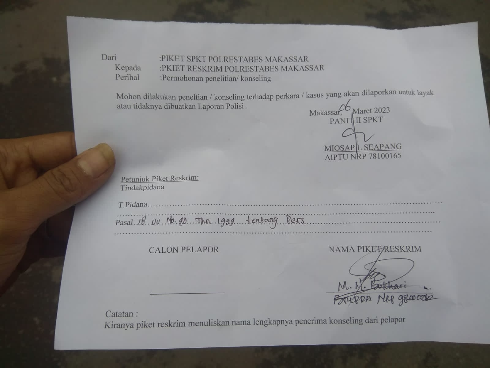 Mendapatkan perlakukan yang tidak semestinya maka seluruh Anggota Awak Media pun langsung melaporkannya ke Kantor Polrestabes Makassar dengan Laporan Polisi (LP) Nomor : 457/III/2023/Reskrim/Restabes MKS/Polda Sulsel.