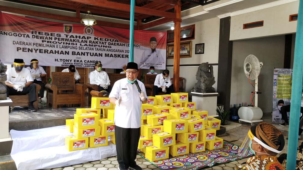 Dalam paparannya politisi senior Partai Golkar Provinsi Lampung H. Tony Eka Candra (TEC) mengatakan, bantuan Puluhan Ribu Masker dan Alat Pelindung Wajah (Face Shield) sejalan dengan Instruksi serta arahan Ketua DPD Partai Golkar Provinsi Lampung yang juga Gubernur Lampung Bapak Ir. H. Arinal Djunaidi, bahwa Kelembagaan Partai Golkar di Provinsi dan Kabupaten/Kota serta Anggota Fraksi Partai Golkar di Legislatif, baik Anggota Fraksi Partai Golkar DPRD Provinsi dan DPRD Kabupaten/Kota wajib berpartisipasi aktif mendukung dan membantu upaya Pemerintah dalam pencegahan, penanggulangan penyebaran wabah Covid-19 khususnya di Kabupaten Lampung Selatan.