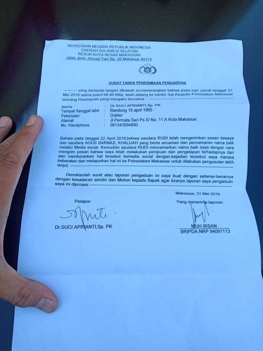 “Ia kami bersama ibu suci sudah melaporkan Rudy ke polrestabes makassar atas dugaan pencemaran nama baik, dan pengancaman yang diduga dilakukan Rudy ke Ibu Suci dan sudah diterima pihak polres”, tutupnya (*)