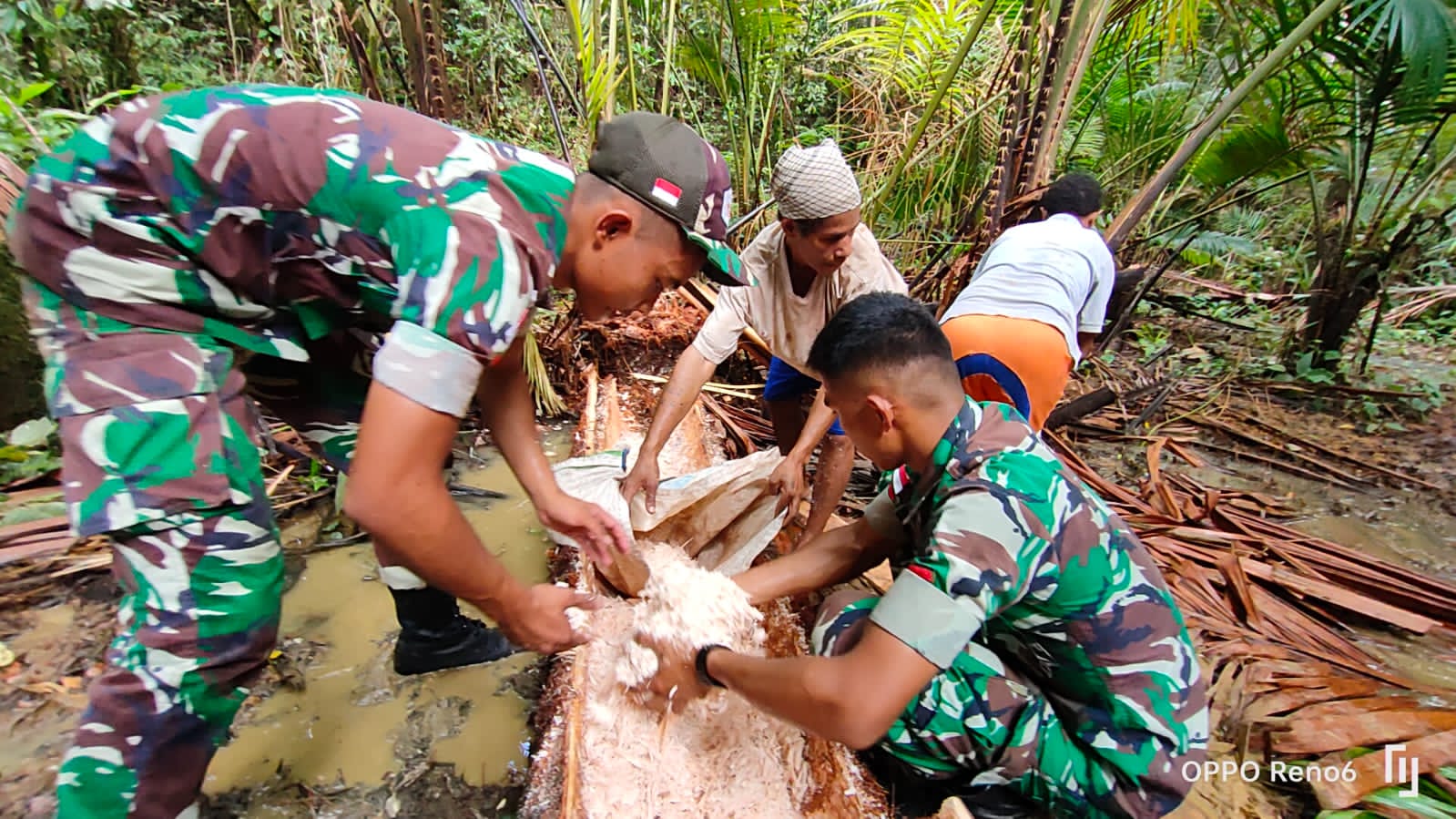 BOVEN DIGOEL sulawesibersatu.com – Prajurit Satgas Pamtas RI-PNG Yonif 725/Woroagi Pos Tembutka Lama yang berada dibawah naungan Kolakops Rem 174/ATW membantu mengolah pohon sagu secara gotong royong bersama masyarakat Kp. Tembutka Lama, Distrik Ninatie, Kab. Boven Digoel, Papua Selatan. Sabtu, (7/1/2023).