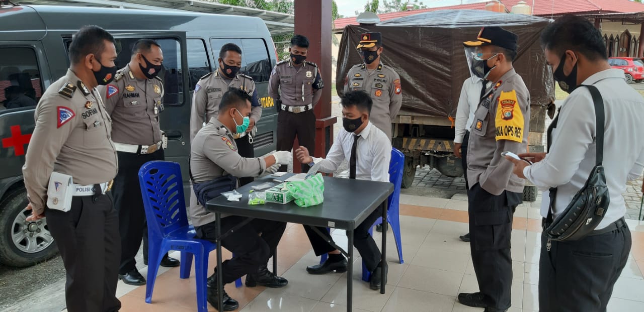 Personil polres pasangkayu yang telah melaksanakan tugas Back Up selama 5 hari di posko Polres Mateng di pimpin oleh KBO Sat Lantas Ipda Agus Tahang S.H bersama 30 personil dari Polres dan Kodim kemudian di periksa untuk memastikan agar personil polres tidak terpapar Covid-19 selama melaksanakan tugas pengamanan dan pengawalan bantuan ke posko mamuju.