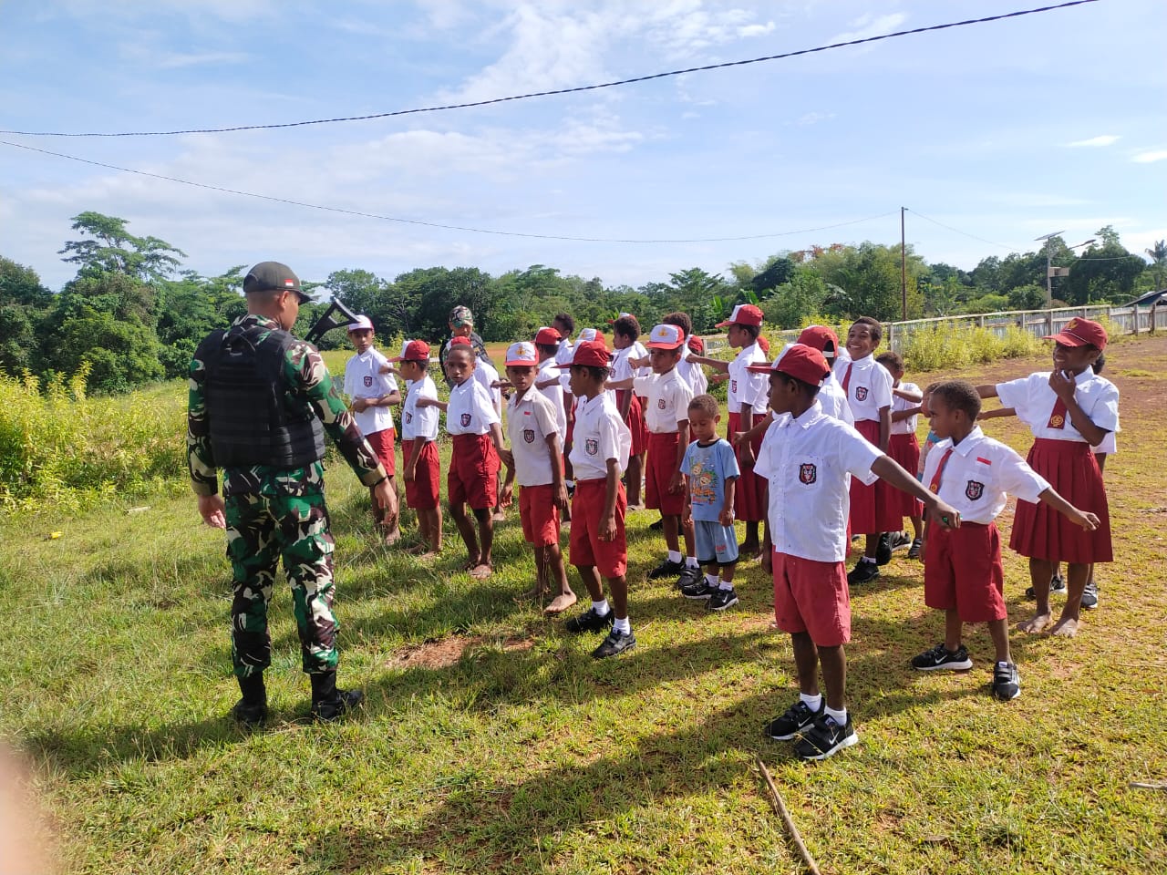 “Adapun kegiatan yang dilaksanakan pada hari ini, adalah memberikan peragaan sekaligus contoh penyelenggaran upacara bendera kepada para siswa-siswi SD YPPK Kp. Umap, dimana selama ini belum pernah melaksanakan Upacara Bendera”, lanjut Letkol Syafruddin.